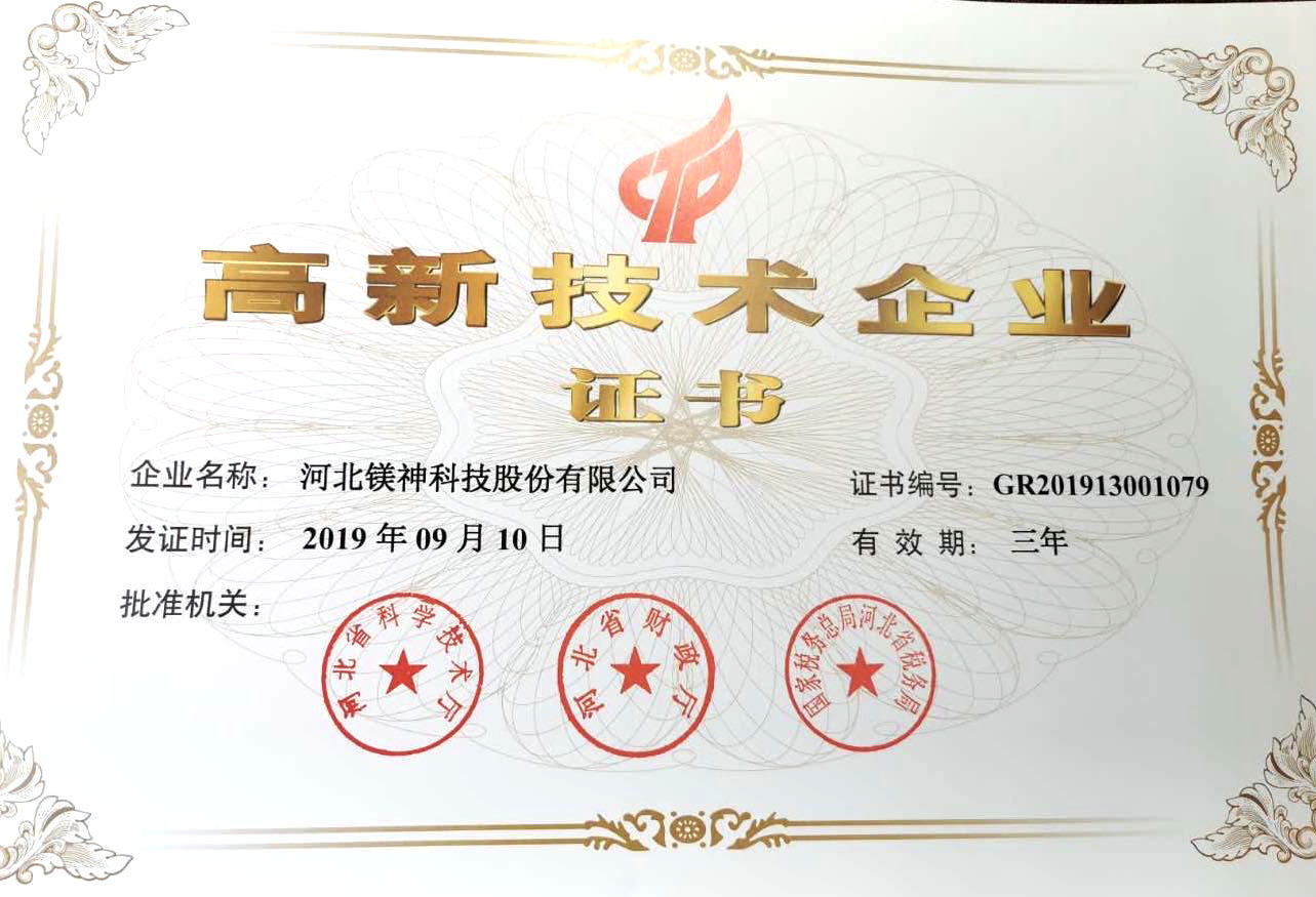 2019年9月10日經(jīng)河北省科學(xué)技術(shù)廳、河北省財(cái)政廳、國(guó)家稅務(wù)總局河北省稅務(wù)局批準(zhǔn),為河北鎂神科技股份有限公司頒發(fā)高新技術(shù)企業(yè)證書(shū),有效期三年。國(guó)家高新技術(shù)企業(yè)門(mén)檻較高,認(rèn)定須經(jīng)過(guò)嚴(yán)格的測(cè)評(píng)和審批程序,鎂神科技憑借過(guò)硬的技術(shù)實(shí)力榮獲高新技術(shù)企業(yè),這標(biāo)志著公司在研發(fā)和創(chuàng)新方面得到國(guó)家相關(guān)部門(mén)的肯定與認(rèn)可。 因此給了我們公司上下員工很大的鼓舞,這更是對(duì)我們企業(yè)快速發(fā)展、自主研發(fā)的肯定,激勵(lì)了我們企業(yè)技術(shù)研發(fā)的建設(shè),推動(dòng)了企業(yè)經(jīng)營(yíng)的進(jìn)程,我們企業(yè)將繼續(xù)保持產(chǎn)品的高品質(zhì)、高質(zhì)量始終如一。