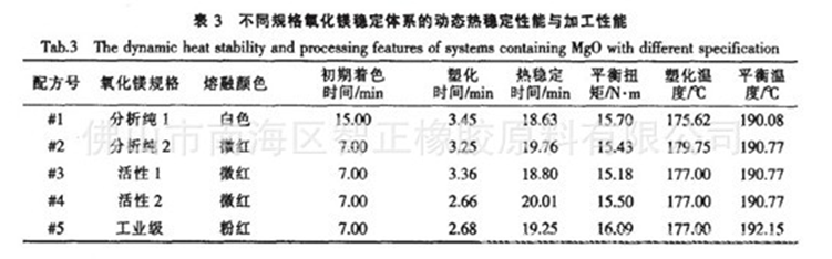 固定氧化鋅為分析純2,用HAAKE流變儀研究了不同規(guī)格氧化鎂穩(wěn)定體系的動(dòng)態(tài)熱穩(wěn)定性能與加工性能,試驗(yàn)結(jié)果見(jiàn)表3。