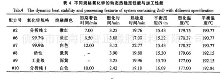 表4中的塑化時(shí)間、平衡扭矩、塑化溫度、平衡溫度等加工性能差別不太,說(shuō)明不同規(guī)格的氧化鋅與不同規(guī)格氧化鎂一樣,對(duì)PvC的加工性能沒(méi)有明顯影響。從表4還可以看到,用不同規(guī)格的氧化鋅,體系的熱穩(wěn)定性能存在較大差別。純度對(duì)于初期穩(wěn)定和熱穩(wěn)定時(shí)間的影響明顯。對(duì)比最為明顯的是兩種高純度氧化鋅,99.9%的氧化鋅比99.7%的氧化鋅的初期著色時(shí)間和熱穩(wěn)定時(shí)間都延長(zhǎng)了5min左右。工業(yè)級(jí)氧化鋅則使物料的初期顏色太深.盡管其熱穩(wěn)定時(shí)間仍然接近20 min。兩種分析純氧化鋅也表現(xiàn)了比較好的熱穩(wěn)定性能。
