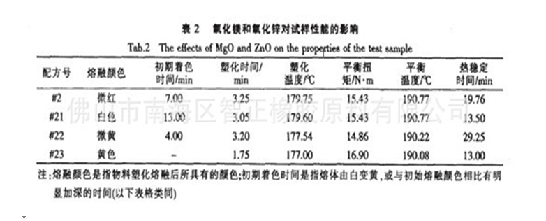 檢驗(yàn)氧化鎂和氧化鋅對(duì)PVC的穩(wěn)定作用及其差別,設(shè)計(jì)配方如表l。固定氧化鎂為分析純2,氧化鋅為分析純2,試驗(yàn)結(jié)果見(jiàn)表2。